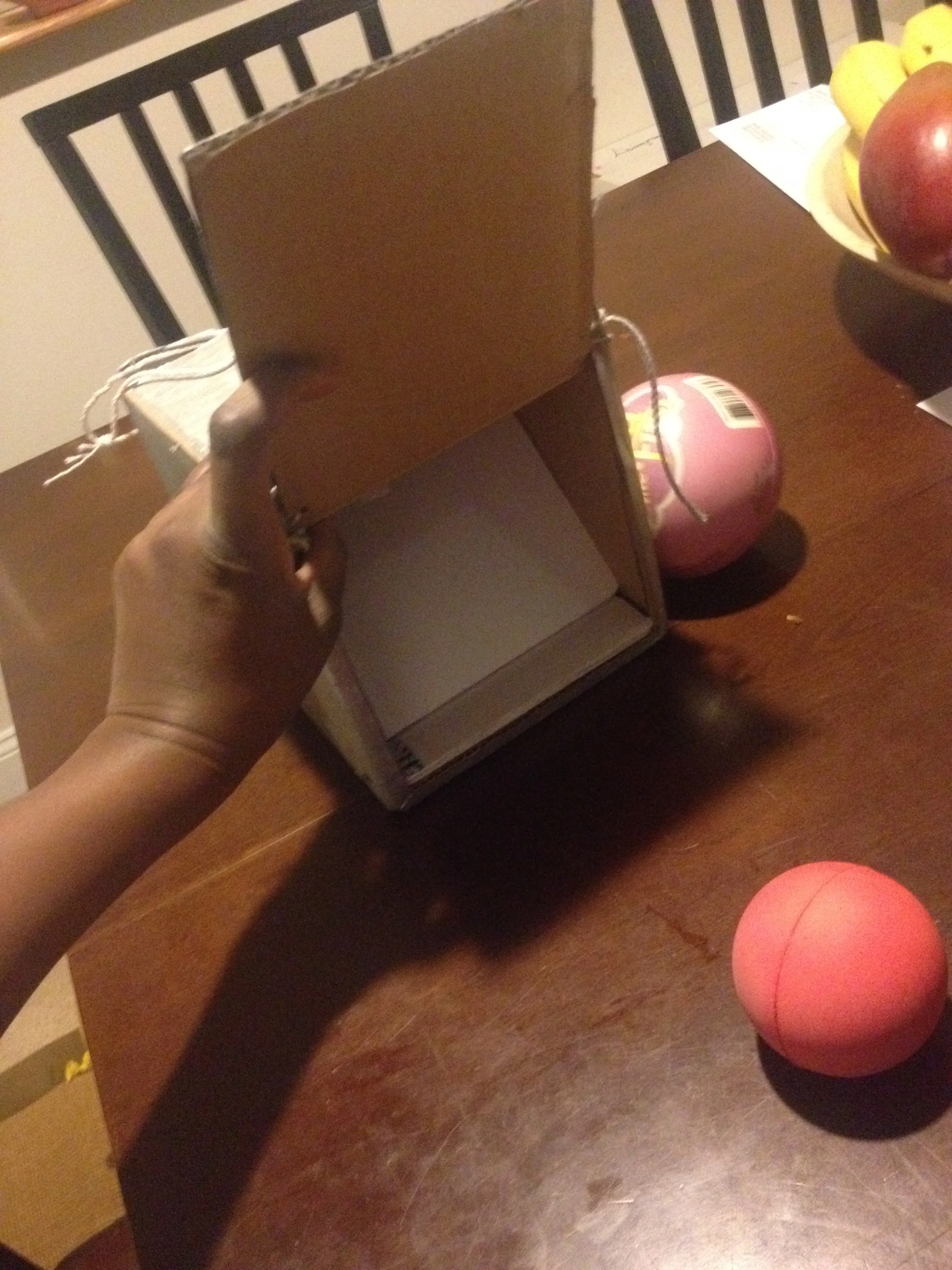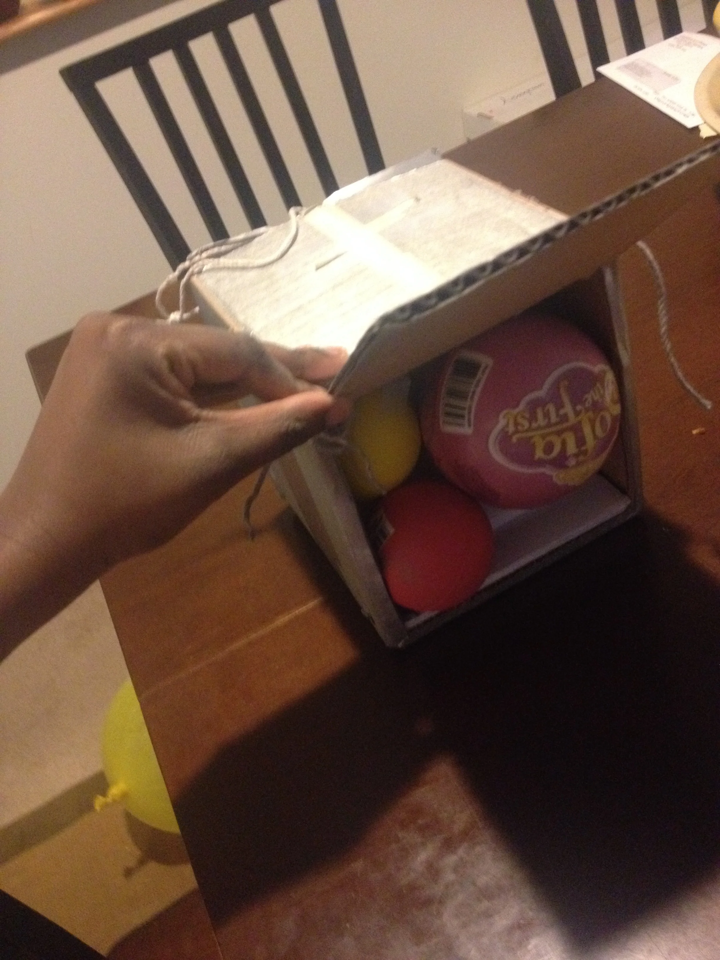 The box and lever prototype wasn't very fun, the air-powered version didn't have the power to scatter the toys, and we couldn't build a safe version that used spring tension.