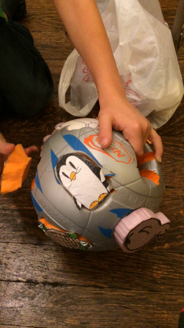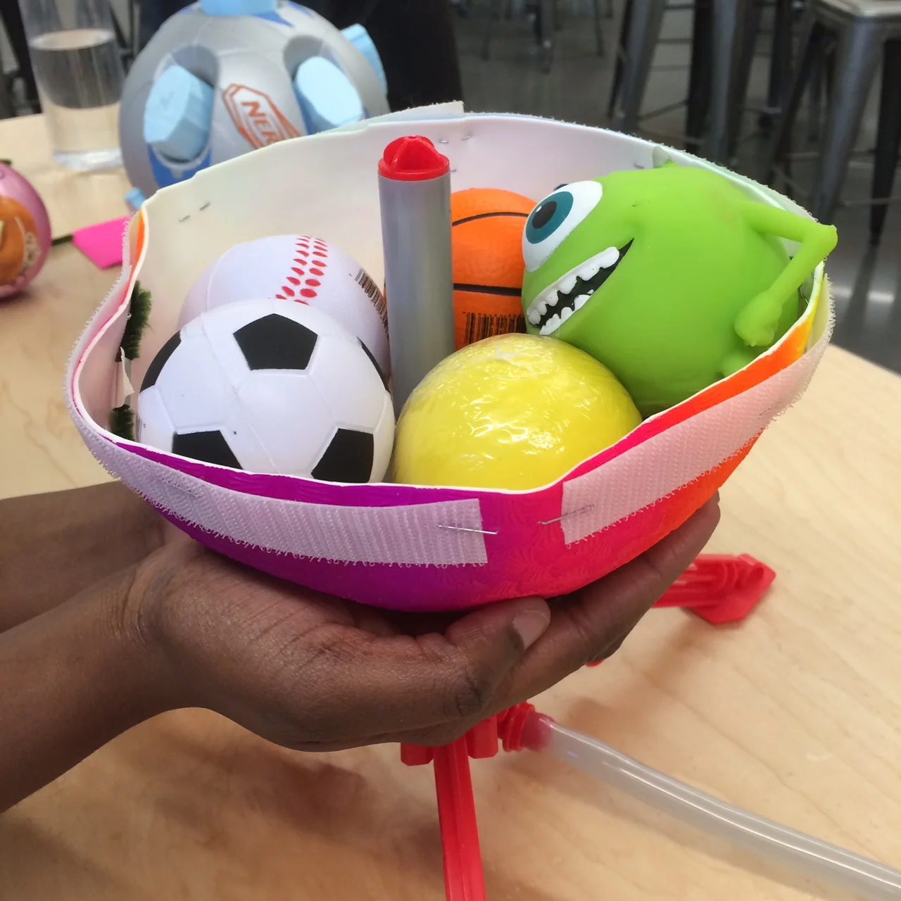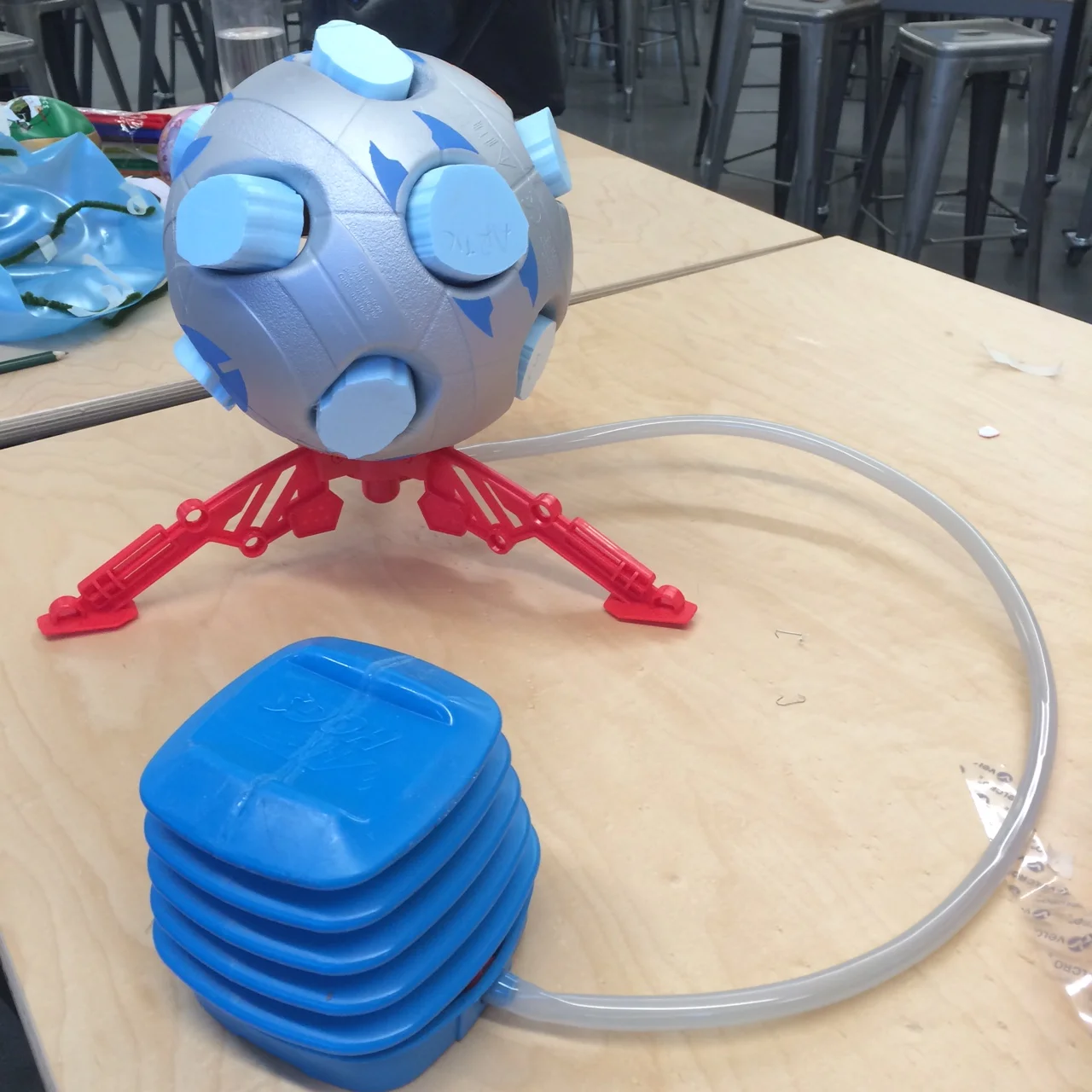 We decided that Fun Grenade could occupy a more differentiated place in the market and chose to refine this prototype. The idea behind the Fun Grenade is a big ball that contains smaller balls, and the big ball pops open and casts the small balls around the room. Initial ideas for how to scatter the parts included spring tension, levers, and air-powered tubes.